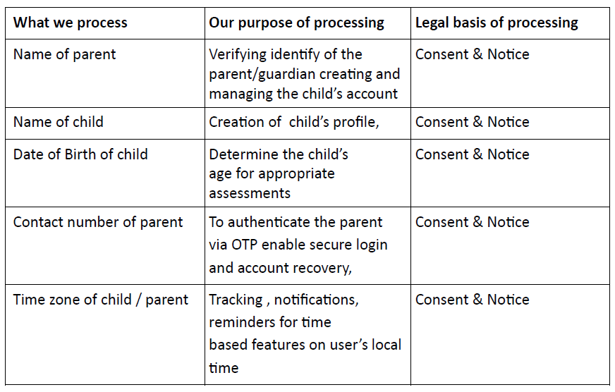 In the course of your interaction with us and your use of our services in the delivery of positive psychology tools to children through a mobile App using immersive Augmented Reality technology we will collect from you the following personal data: